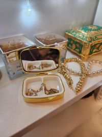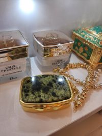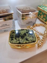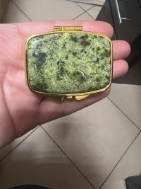 Очень красивая и стильная таблетница - шкатулочка, подойдёт для хранения даже небольших украшений. Таблетница покрыта золотистым металлом, что прекрасно сочетается с отделкой натуральным камнем зелёного оттенка. Внутри есть зеркало и два отделения для таблеток. Не тяжёлая, можно носить с собой в косметичке или оставить на туалетной столике. Украсит любой интерьер. Прекрасный подарок особенно в комплекте с аналогичными предметами в таком же дизайне!Отзыв