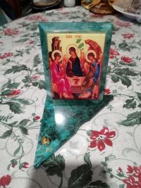 Икона с подсвечником Святая Троица средняя из змеевика 12х12х13 см размером 12х12х13 см и весом 600 г.