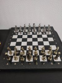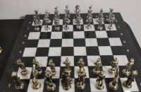 Исторические шахматы – новинка в нашем ассортименте. Шахматные фигуры в золотом цвете – русские войска во главе с Александром I, с другой стороны в серебряном цвете – французские войска во главе с Наполеоном Бонапартом. Фигуры выполнены из металла с высокой степенью детализации игровых персонажей. Доска изготовлена из уральских камней: черного змеевика и белого мрамора. В комплекте оригинальный кейс из экокожи.