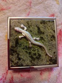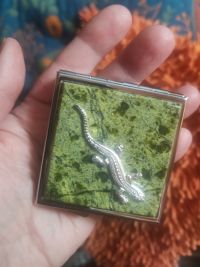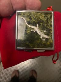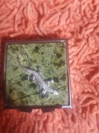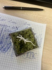Таблетница на 4 отделения с ящерицей камень змеевик цвет серебро размером 6х6х1,5 см и весом 70 г.