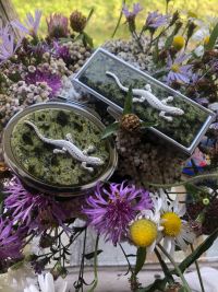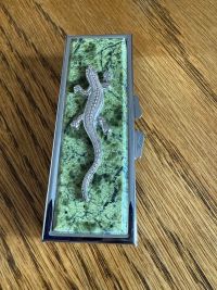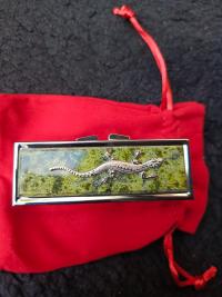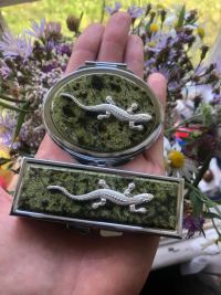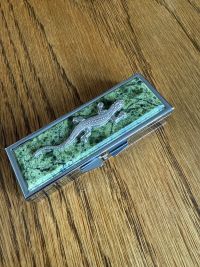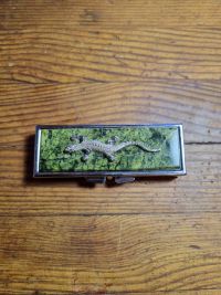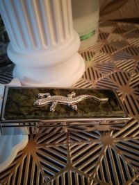 Таблетница на 3 отделения с ящерицей камень змеевик цвет серебро размером 8,5х3,5х1,5 см и весом 60 г.