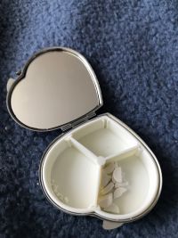 Красивая, качественная таблетница в форме сердца с вставкой из натурального камня, всё как в описании.Пользуюсь уже долго, очень довольна покупке.Замочек удобный, таблетки не перемешиваются при встряхивании- для меня это важный момент.Жаль нет таких с 4 отделениями.Заказывала 2 раза квадратную, там таблетки просто гуляют, пришлось вернуть.заказ пришёл быстро в надёжной упаковке.Удобство.