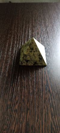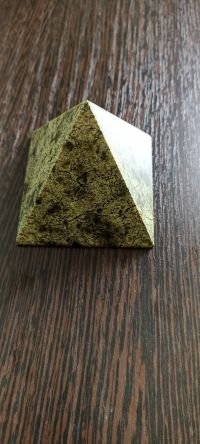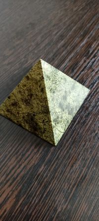 Пирамида красивая из натурального камня змеевика , зеленоватого оттенка с редкими но эффектными искорками иризации. Сделана качественно хоть и форма слегка несовершенна,что говорит о ручной работе. Без сколов и шероховатостей с гладкой глянцевой поверхностью.