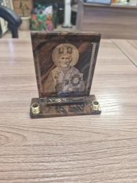 Икона настольная "Св. Николай Чудотворец" из обсидиана с подсвечниками размером 9х3,5х9,5 см и весом 200 г.