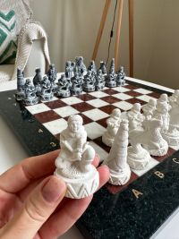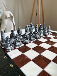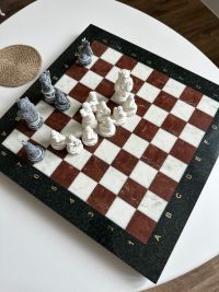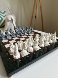 Шахматный набор изготовлен вручную, доска нескладная из натурального камня, шахматные фигуры из искусственного мрамора.