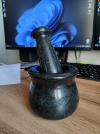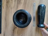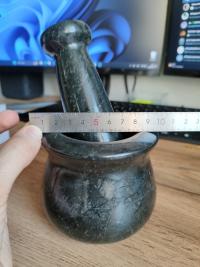 Каменная ступка из черного змеевика размером ступка 10,5х10,5х9 см, пестик 4,5х4,5х14,5 см и весом 1800 г.