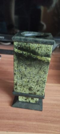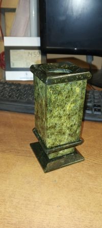Карандашница настольная из камня змеевик размером 6,5х6,5х13,5 см и весом 660 г.