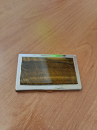 Карманная визитница из камня тигровый глаз цвет серебро размером 9,5х6х1 см и весом 90 г.