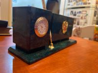 Очень красивый набор. Выглядит солидно. Качественно сделан. Приятный цвет камня. Набор с часами, ручкой, также емкости для бумаг и мелочей.. Для подарка идеальный вариант. Мне всё понравилось.Хорошо упаковано. Красивый, достойный набор