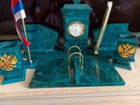 Настольный канцелярский набор с гербом и флагом России камень змеевик размером часы 13х11х27 см, визитница 17х11х14 см, карандашница 7х7х12 см, флагшток 5х5х27 см, подставка под календарь 26х16х3 см и весом 6000 г.