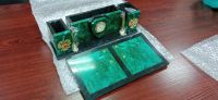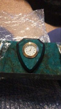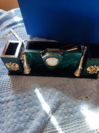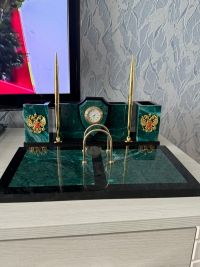 Письменный прибор «Щит» изготовлен из природного змеевика с Южно-Шабровского месторождения (Свердловская область). Этот минерал ценится за свой благородный зелёный оттенок, характерный рисунок и прочность. Комплект включает всё необходимое для организации рабочего стола: подставку с двумя шариковыми ручками, часы, перекидной календарь и декоративные дуги.
