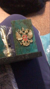 Письменный набор упакован в коробку и готов к вручению. Он подойдёт в качестве делового подарка, предмета интерьера в кабинете или офисе, а также как сувенир с уральским характером.