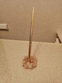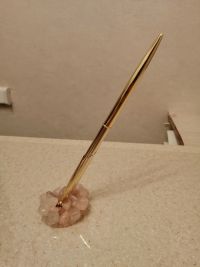 Ручка металлическая на подставке из розового кварца размером подставка 50х50х70 мм, ручка 165х7 мм и весом 60 г.