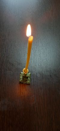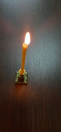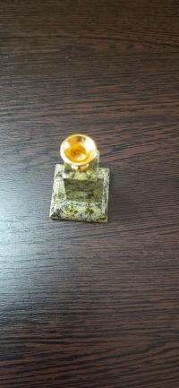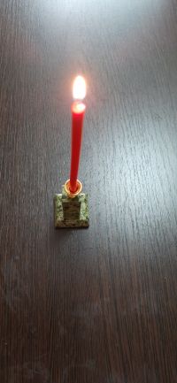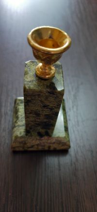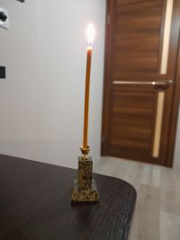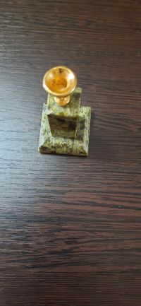 Красивый подсвечник из змеевика. Аккуратная сборка и качественная шлифовка камня. Тяжелый, устойчивый, не низкий, не высокий, а очень удачных габаритов. Единственный недостаток - маленькое отверстие под свечу. На мой взгляд оптимальный размер - 10мм, а не 0.7 мм, т.к. в такое отверстие встанет любая церковная свеча.не очень большой размер