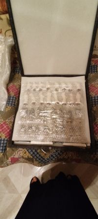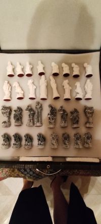 Кортонная коробка, внутри чемодан внушительных размеров. В нём проложено пенопластом и тонкий паралон. Фигуры не зафиксированны, но прилегают плотно. Чемодан закручивается на винт. Фигуры все чёткие. Очень интересный дизайн и необычный дизайн. Доска огромная, тяжёлая и красивая ? Купила мужу подарок на НГ. Надеюсь понравиться. Один конь имеет 2 пятнышка. Видимо при заливке что то попало. При открытии чувствуется запах недавно слеланых фигур.Отзывы с оценкой