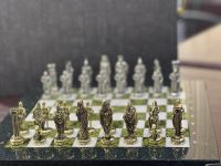 Шахматы выполнены из натурального камня мрамор и змеевик, фигуры из металла с покрытием под золото и серебро, имеют размеры доски 36х36х2,5 см и весят 7500 г.