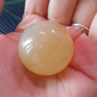 Очень красивый шарик, тяжёлый, прохладный и гладкий на ощупь, хотя медовый по цвету только с одной стороны, с другой - больше молочный, словно разделенный на две половинки кольцами. Понимаю, что шар изготовлен из натурального камня, но все-таки тёмное пятно от включения на "кольцах" сильно выделяется на общем фоне (его видно на видео). Спасибо.Натуральный камень, хорошо обработан, гладкий