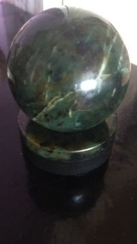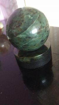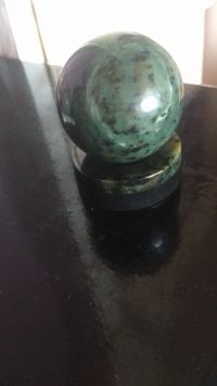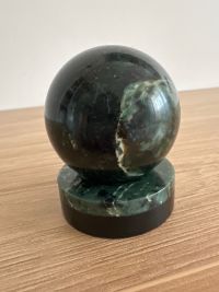 Хорошо отполированный шар из нефрита. Цвет от светло-зеленого травянистого до почти черного. Подставка склеена из двух частей: верхняя из зеленого нефрита, нижняя - черная. Шар прекрасно выглядит и приятно лежит в руке.Совершенно гладкий шар без дефектов