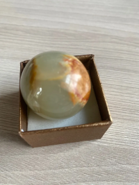 Очень красивый экземпляр. Коробочка в пакетике с артикулом, в ней пупырка, в пупырке красивейший шар Халцедона структуры Оника. Оникс это вид структуры - текстуры Халцедон. На разновидности Халцедона Агаты, Сардониксы(ониксы сердца) можно любоваться постоянно. Хороший размер. Удобно катать в руках или делать массаж. Расслабьтесь и фэншуйствуйте ! ;)Отзыв