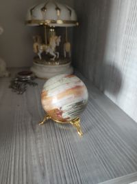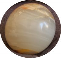 Идеально исполненный шар, приятно держать в руках, сколов и царапин нет. Досталась расцветка на треть юпитерианская, на две трети ровная ониксоваяпришел целый, в коробочке, красивый!