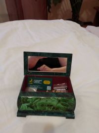 очень красивая шкатулка,тяжелая,сделана очень окуратно,хорошая полировка,композиция и цвет,упакована надежео,сцперОчень понравилась