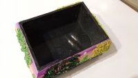 Великолепная шкатулка из черного змеевика, украшенная сбоку рисунком (летний пейзаж) и мелкой цветной каменной крошкой. Сделано очень аккуратно и ,чувствуется,что с любовью. С любовью к своему произведению. А это настоящее произведение искусства. С удовольствием человек, которому предназначен подарок, будет хранить здесь свои украшения. Хочу добавить, что заказывала здесь шкатулки уже несколько раз. И всегда получала всё очень хорошо упаковано и без сколов или царапин. Чувствуется, что продавец дорожит своими покупателями. Спасибо. Осенью буду делать следующий заказ в подарок.Ручка на крышке наклеена не по центру.