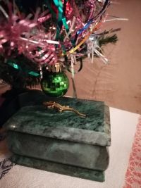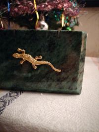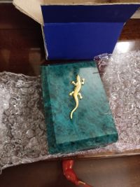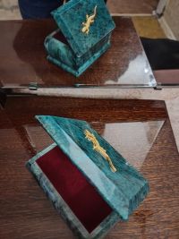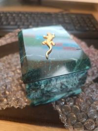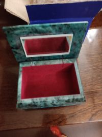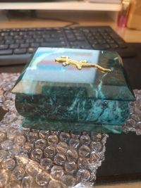 С виду, как будто малахитовая. Довольно тяжёлая, хоть и крохотная. И ящерка сверху так прекрасно дополняет узор камня, что без неё невозможно шкатулку представить. Единственный совет великолепным мастерам: не красить внутренний материал красными чернилами. Стала протирать внутри шкатулки, и такой неприятный сюрприз (тряпка моментально окрасилась). Хоть это и мелочь, но в такой замечательной вещице всё должно быть прекрасно.Рекомендую в домашний интерьер и для подарка.