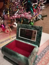 Небольшая, красивая, весомая шкатулка, вызывает ассоциации со сказами Бажова. Внутри материал похож на напыление, но с функцией защиты справляется. Зеркало внутри небольшое, но качественноеОтзыв