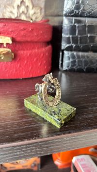 Решила собрать все фигуры китайского гороскопа,это одна из них-год Лошади.Боялась что металл будет слишком темный,но нет,есть "позолочение" и фигурка очень достойная.Маленькая лошадка правда,но аккуратная.Также камень змеевик весьма хорошего качества.Красивая и мощная вещь!!!