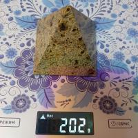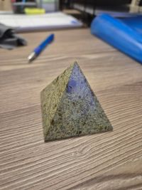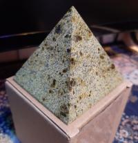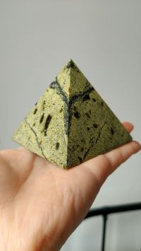 Пирамида изготовлена вручную из камня змеевик, имеет размеры 6х6 см и весит 200 г.