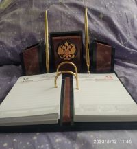 Письменный набор "Канцелярский" с гербом камень лемезит размером календарница 26х15х3,5см, карандашница 26х8х13,5см и весом 3480 г.