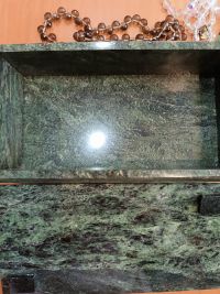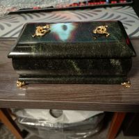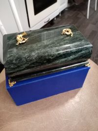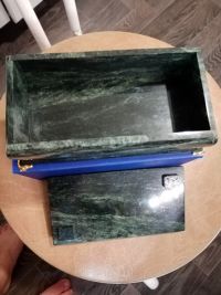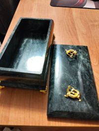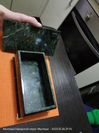 искал подарок на на семейное торжество. Остановился на сей шкатулке уральских мастеров. Простая форма, чёткая геометрия, ножки придают лёгкость и изыск. Крышка отлично подогнана и легко ложится сверху. Красивая работа, такое приятно было подарить. Вместо пластика, папье-маше натуральный камень во всей красе. Хороший, ёмкий подарок на память. Ещё, внутрь отлично входят банкноты.Шкатулка очень понравилась.