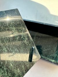 Упакован очень тщательно: коробка из гофрокартона, пленка с пупырышками, бумага, еще пленка, бумага, еще коробка, еще пленка. На камне ни одной трещины. Цвет соответствует описанию (темно-зеленый). Следов клея не видно, металлические элементы приклеены надежно. На столе стоит ровно, все ножки выровнены. Из минусов: только хотела заказать себе такую же (эту брала на подарок), да ещё со скидкой - товар исчез из продажи:( Хороший вариант для подарка близким людям (не употребляющим спиртное), приятно иметь такую шкатулку дома.Большое спасибо!