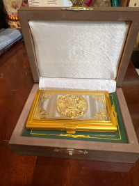 Металлическая визитница "Герб России" в подарочном футляре Златоуст размером визитница 9,5х6,5х1 см, деревянная коробка 14х11х4 см и весом 350 г.